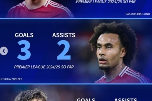 体育资讯4月6日讯 德转对比了曼联三前锋霍伊伦、齐尔克泽以及加纳乔近两个赛季联赛参与进球数据,本赛季三人的进球、助攻均下滑明显,以下为具体数据: